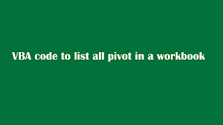 Here is the excel macro which will give us list of all pivot in a workbook: Option Explicit Sub List_All_Pivots() ' Author: Dreams24 ' Written for VBA Tricks and tips blog ' https://www.vbatricksntips.com Dim pt As PivotTable Dim ws As Worksheet Dim strPvt As String Dim i As Integer strPvt = "" i = 1 'For loop through each worksheets For Each ws In ActiveWorkbook.Worksheets Worksheets(ws.Name).Select 'Loop to select each pivot table for a single worksheet For Each pt In ws.PivotTables 'Pass Pivot names to variable in order to show in message. comment or delete this if not required strPvt = strPvt & i & ". " & pt.Name & vbNewLine 'Uncomment below line to get pivot table list in sheet1 'ActiveWorkbook.Sheets("Sheet1").Range("A" & i).Value = pt.Name i = i + 1 Next pt Next ws MsgBox "List of Pivot Tables as Below: " & vbNewLine & vbNewLine & strPvt, vbInformation, "Pivot List" End Sub